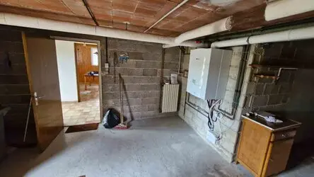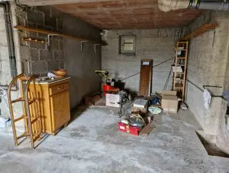 Le rez-de-chaussée est composée d'un garage pour 2 voitures (1 porte basculante motorisée - 1 lucarne), d'une pièce à vivre (2 fenêtres), d'un bûcher (1 fenêtre), d'une cave (1 lucarne) en 2 parties